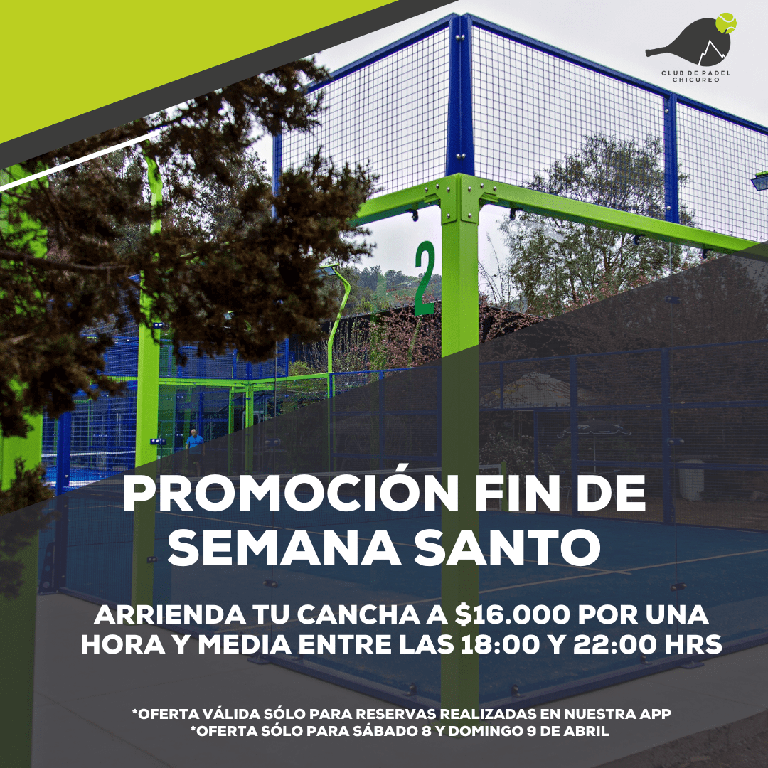 🤩 Pensamos en los padeler@s que se quedan en Santiago el fin de semana santo y les traemos esta espectacular promoción. ¿Qué debes hacer? Realizar tu reserva a través de nuestra APP y juega una hora y media por $16.000 entre las 18:00 y 22:00 horas.